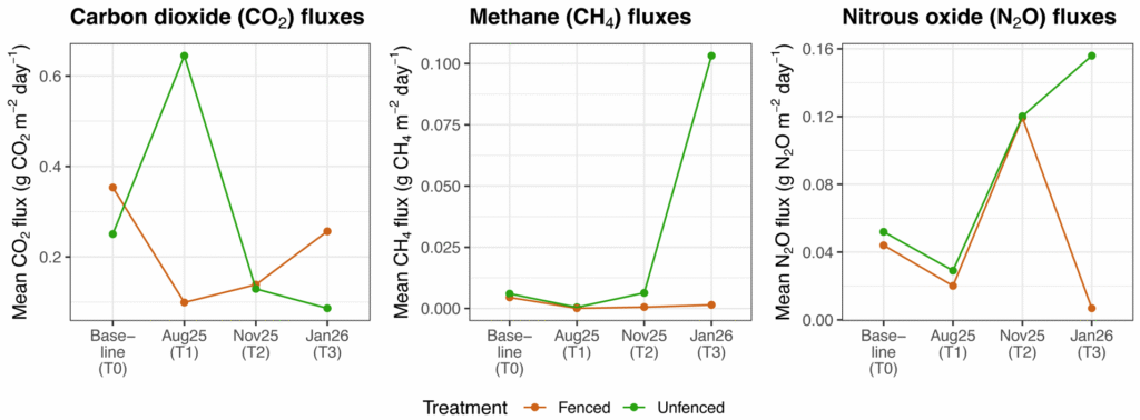 Lukas from RMIT said: “It’s still early days, but we are seeing some interesting trends at our Bridgetown site. There is an indication that methane and nitrous oxide fluxes spike as cows enter the water to cool off in early summer (as expected), so there is an early treatment effect there. But we’ll need more data to see long-term effects.”